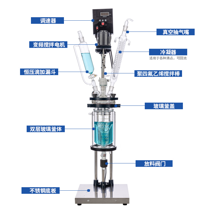 本機(jī)具有電動(dòng)恒速攪拌系統(tǒng)、冷凝、滴加系統(tǒng),釜體夾層需外接加熱或制冷的循環(huán)設(shè)備。在攪拌物料的同時(shí),通過夾層注入循環(huán)的熱溶液或冷卻液,對(duì)釜內(nèi)的物料進(jìn)行恒溫的加熱或制冷。物料進(jìn)行加熱反應(yīng)時(shí),在真空條件下可以提高蒸發(fā)效率(需連接真空裝置),溶媒蒸汽經(jīng)玻璃冷凝盤管時(shí)冷卻成液體(需連接冷卻裝置),可回流到釜內(nèi),也可通過回流彎頭下部閥門進(jìn)行回收。反應(yīng)完畢,物料可從釜底的側(cè)出料口放出。