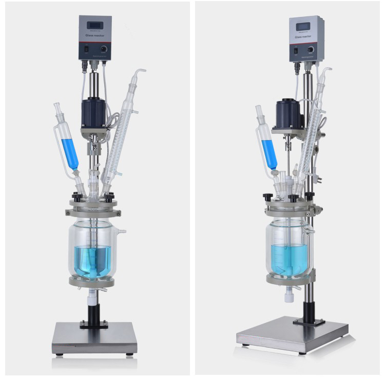 本機具有電動恒速攪拌系統、冷凝、滴加系統,釜體夾層需外接加熱或制冷的循環設備。在攪拌物料的同時,通過夾層注入循環的熱溶液或冷卻液,對釜內的物料進行恒溫的加熱或制冷。物料進行加熱反應時,在真空條件下可以提高蒸發效率(需連接真空裝置),溶媒蒸汽經玻璃冷凝盤管時冷卻成液體(需連接冷卻裝置),可回流到釜內,也可通過回流彎頭下部閥門進行回收。反應完畢,物料可從釜底的側出料口放出。