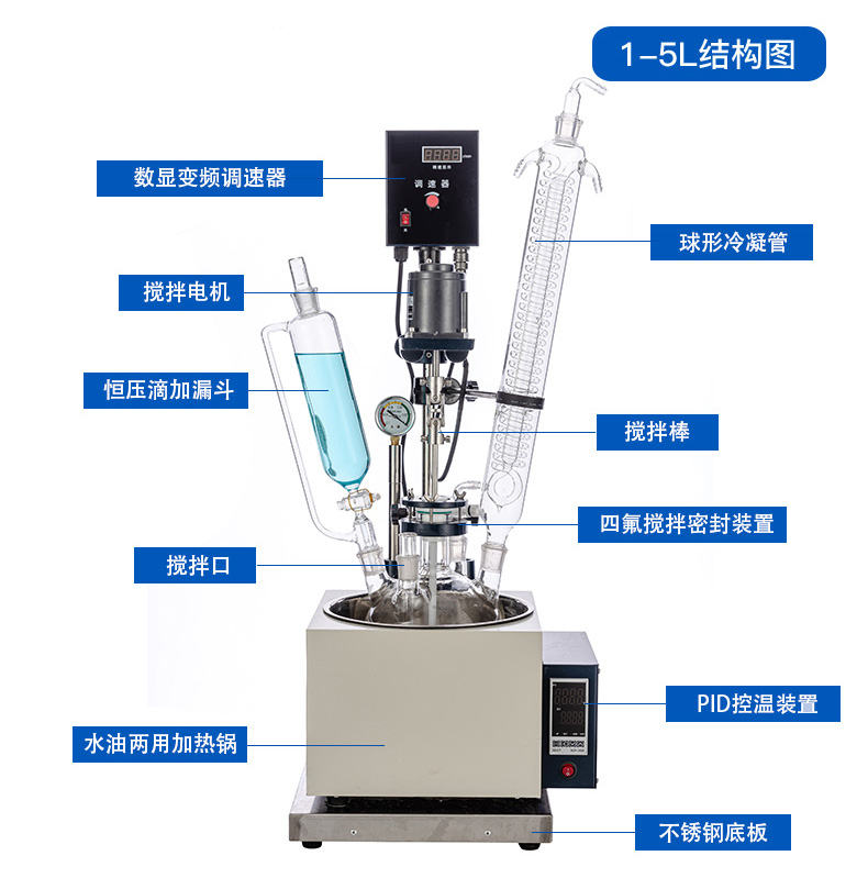 單層玻璃反應釜利用原裝的加熱油水兩用浴鍋,在恒溫條件下進行各種生化反應和合成反應,儀器全系統為封閉狀態,物料在常壓和負壓多種條件下進行氣化、蒸發、冷凝回流、濃縮和提純,一機多用,大容量玻璃反應釜適用于現代化學、精細化工、生物制藥、新材料合成的理想中試、生產系統設備。